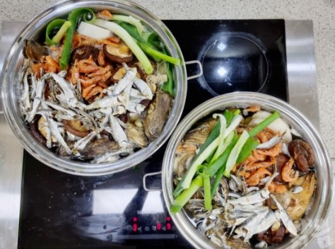 (2) 육수 끓이기 큰 냄비에 물을 붓고 준비한 재료를 모두 넣어 중불에서 서서히 끓입니다. 끓기 시작하면 다시마는 10분 후 건져내어 쓴맛을 방지합니다. 나머지 재료들은 40~50분간 중불에서 계속 끓여줍니다. 이 과정에서 거품이 생기면 걷어내 맑은 육수를 유지합니다.