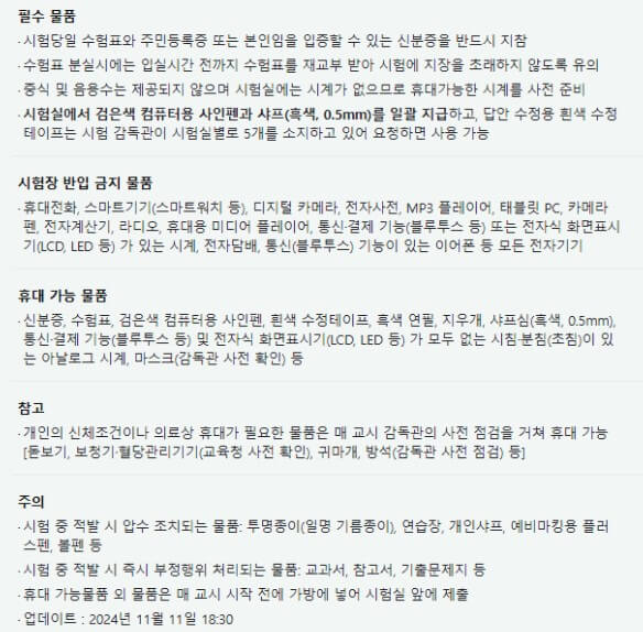 신분증(주민등록증, 운전면허증, 여권 등)과 수험표는 시험장에 입장하기 위해 반드시 필요한 서류이다. 신분증이 없으면 시험장에 입실할 수 없으며, 수험표에는 수험생 정보와 시험장 정보가 기재되어 있으므로 시험 당일 아침에 잊지 않고 챙기는 것이 중요하다. 수험표를 분실했을 경우, 반드시 미리 재발급 받아야 한다.